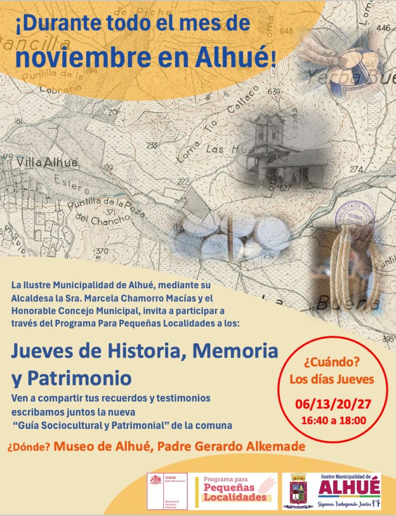 Durante el mes de noviembre se desarrollarán diversas actividades orientadas a reconocer la historia y memoria de Alhué. Una de las más destacadas consiste en encuentros comunitarios que se realizarán todos los jueves del mes, con el objetivo de recopilar y registrar los testimonios de vecinas y vecinos sobre sus historias de vida y aquellos elementos del territorio que consideran más significativos para la identidad comunal.