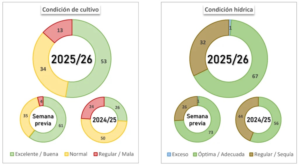La soja en Argentina se calificó como deficiente en un 13%, regular en un 34% y excelente en un 53% a finales de la semana pasada. Este porcentaje ha disminuido un 8% con respecto a la semana anterior. La humedad del suelo para la soja se ha calificado como deficiente en un 32% y favorable en un 67%. Este porcentaje ha disminuido un 6% con respecto a la semana anterior. A continuación, se presenta la calificación de la soja en Argentina al 21 de enero de 2026, según la Bolsa de Cereales de Buenos Aires.