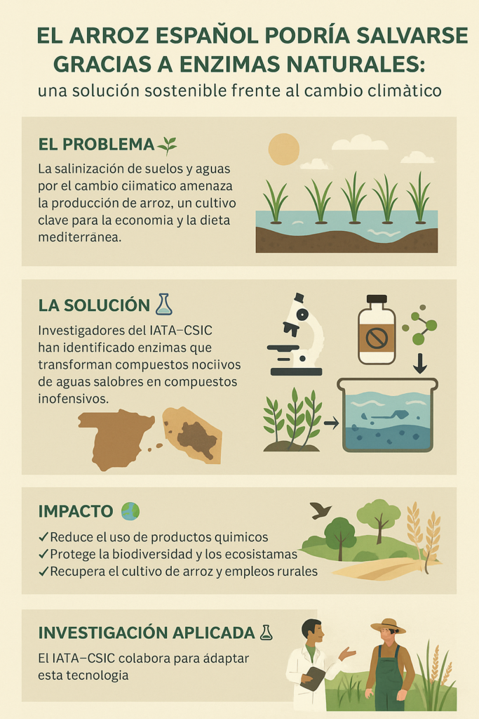 La creciente salinización del agua y los suelos agrícolas, agravada por el cambio climático, amenaza gravemente la supervivencia del cultivo de arroz en zonas clave como la Albufera de Valencia. Ante este reto, un equipo del Instituto de Agroquímica y Tecnología de Alimentos (IATA-CSIC) lidera una investigación pionera que emplea enzimas naturales para depurar aguas salobres, ofreciendo una alternativa sostenible y efectiva frente a esta problemática.