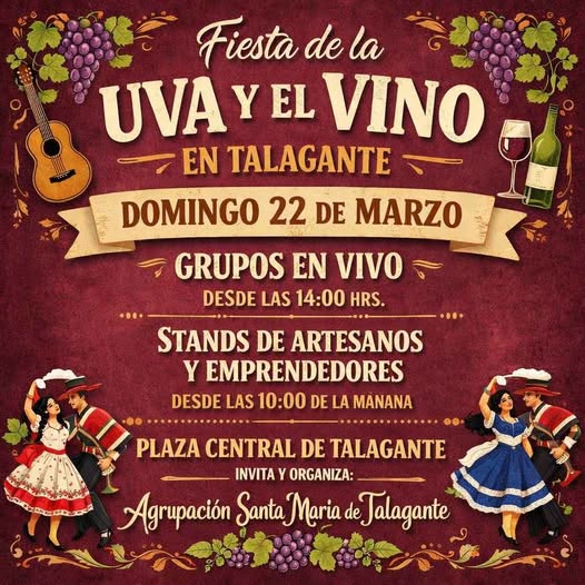 Una jornada cargada de tradiciones, música y emprendimiento se vivirá este domingo 22 de marzo en la Plaza central de Talagante, con la realización del evento “Fiesta del Vino y la Uva”, organizado por la Feria de Emprendedores Isla de Maipo junto a la Agrupación Folclórica Santa María de Talagante.