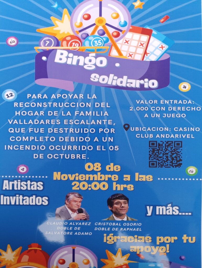 Este sábado 8 de noviembre, a partir de las 19:00 horas, el Casino del Club Andarivel de El Monte será el escenario de un gran bingo show solidario organizado para ayudar a la familia montina Valladares-Escalante, quienes perdieron todo su hogar y pertenencias en un devastador incendio ocurrido el pasado 5 de octubre.