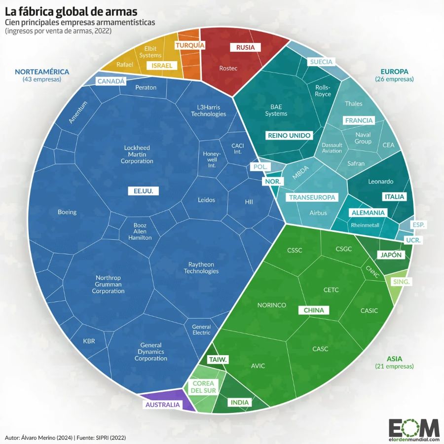 Según el SIPRI, Estados Unidos ha consolidado aún más su dominio como proveedor de armas en un mundo cada vez más multipolar. Su estudio actualizado a fines de 2025 alega que los importadores de armas estadounidenses las prefieren por su avanzada capacidad tecnológica y, además, porque contribuyen comercialmente a fomentar buenas relaciones con ese país. Como subraya el SIPRI, para Estados Unidos la exportación de armamento constituye “una herramienta de política exterior y una manera de fortalecer su industria armamentística, como vuelve a dejar claro la nueva Estrategia America First de Transferencias de Armas de la administración Trump”. Realidad que se convierte en la principal clave de interpretación de la presión que, desde su primer día como presidente, Donald Trump ha ejercido sobre sus aliados de la OTAN para que aumenten significativamente sus propios presupuestos de defensa. Tras esta pulseada, y ya en el horizonte, nuevos y fructíferos negocios para las multinacionales estadounidenses de la industria bélica. En la actualidad, 39 de las top 100 multinacionales son norteamericanas. (ver informe SIPRI)