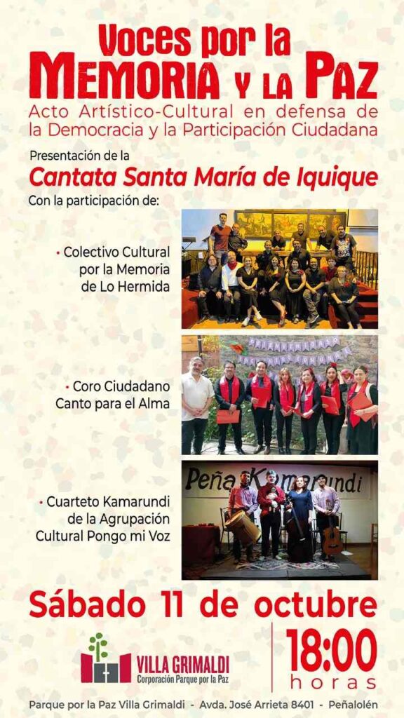 Cerrará la jornada el “Colectivo Cultural por la Memoria de Lo Hermida”, conformado por vecinas y vecinos que mantienen viva la Cantata Santa María de Iquique, reivindicando la memoria popular y las luchas del pueblo a través del canto colectivo.