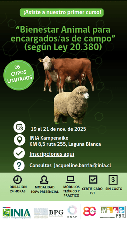 Con el propósito de fortalecer las capacidades técnicas del sector ganadero regional, el Instituto de Investigaciones Agropecuarias (INIA Kampenaike) realizará su primer curso de capacitación en “Bienestar Animal para encargados/as de campo (según Ley 20.380)”, orientado a entregar conocimientos y competencias clave para cumplir con los requisitos establecidos por el Servicio Agrícola y Ganadero (SAG), informaron de este organismo dependiente de MINAGRI.