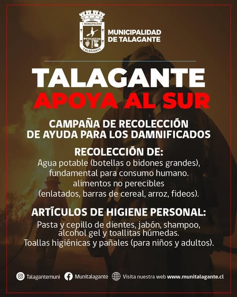 La Municipalidad de Talagante ha iniciado una campaña de recolección de ayuda para apoyar a las familias damnificadas por la emergencia que afecta al sur de Chile. La iniciativa, que se extenderá hasta el jueves 22 de enero, busca reunir elementos básicos y de primera necesidad para quienes han sido afectados por esta crisis.